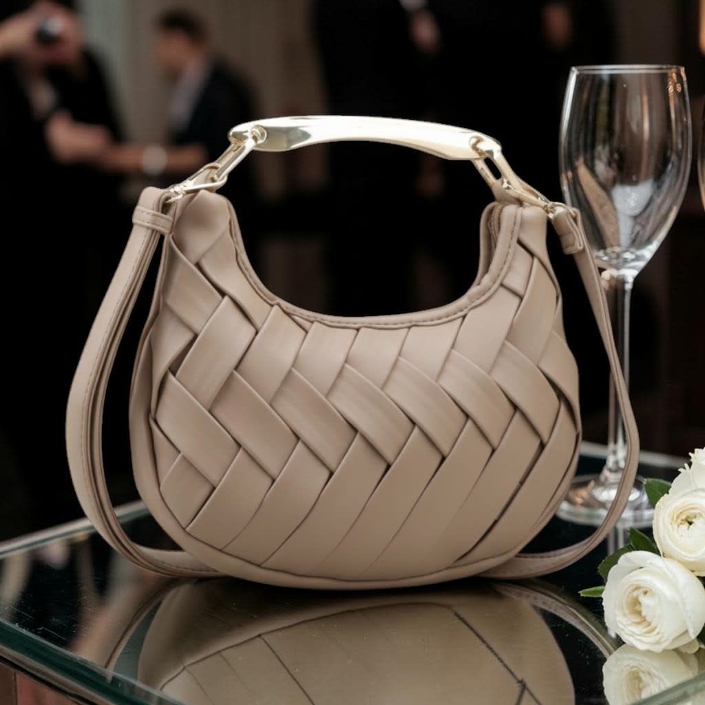 Deslumbra en tu próximo evento con este exclusivo bolso de fiesta en un elegante tono taupe. Su diseño artesanal con intrincado tejido trenzado aporta textura y clase. El asa metálica dorada esculpida es el detalle de lujo definitivo, convirtiéndolo en una verdadera joya. Incluye correa ajustable extraíble para mayor versatilidad. El toque final perfecto para tu look de gala