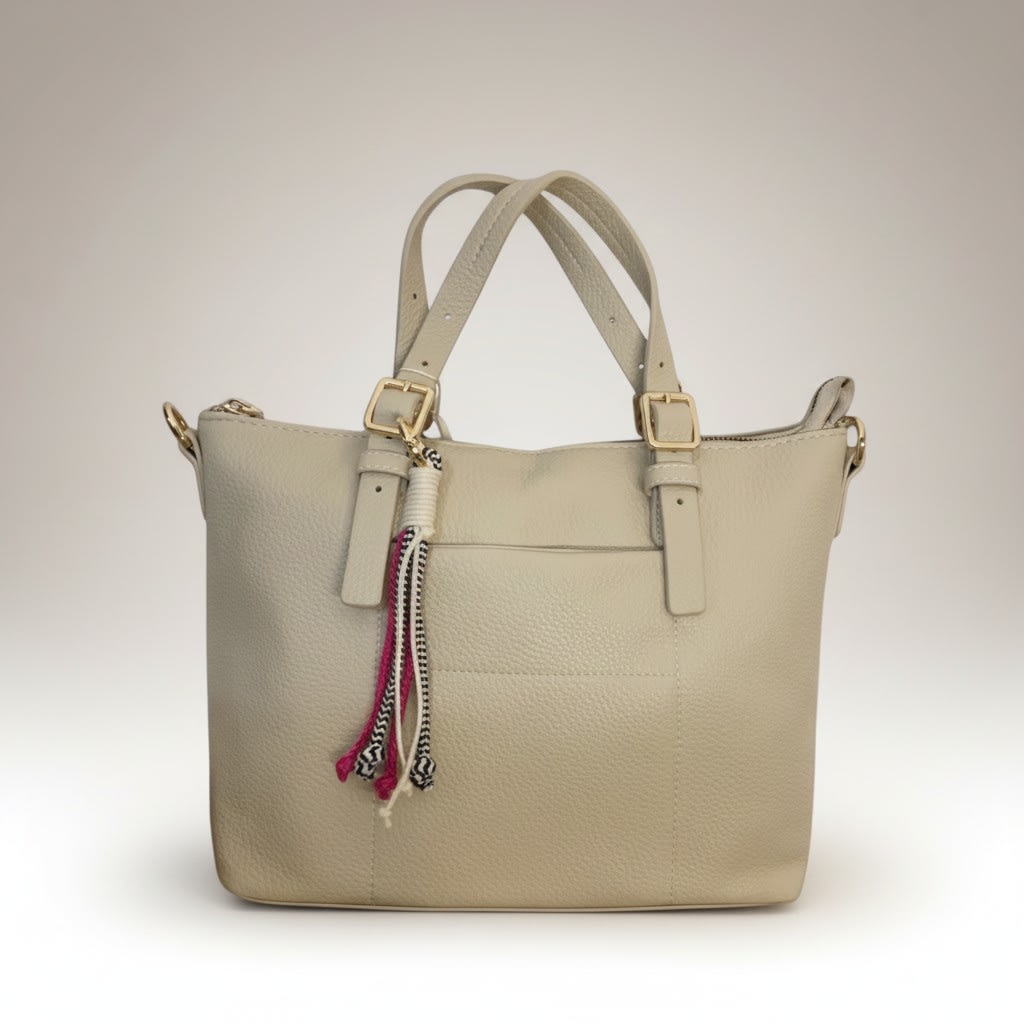 Amplitud y estilo en un solo bolso. Polipiel granulada en tono khaki con asas dobles para llevar al hombro y correa extraíble para cuando prefieras la bandolera. Los herrajes en dorado y el detalle de flecos trenzados en blanco, negro y fucsia le dan ese punto de personalidad que lo hace único.