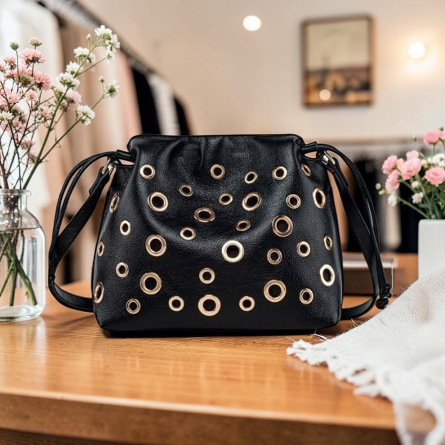 Bandolera "Grommet Elegance" – Textura y Diseño Único Realza tu look con esta bandolera exclusiva confeccionada en cuero sintético de alta calidad con acabado graneado. Su diseño distintivo de ojales dorados no solo aporta un aire moderno y audaz, sino que la convierte en la pieza central de cualquier outfit. Compacta pero espaciosa, es el equilibrio perfecto entre moda vanguardista y funcionalidad diaria.
